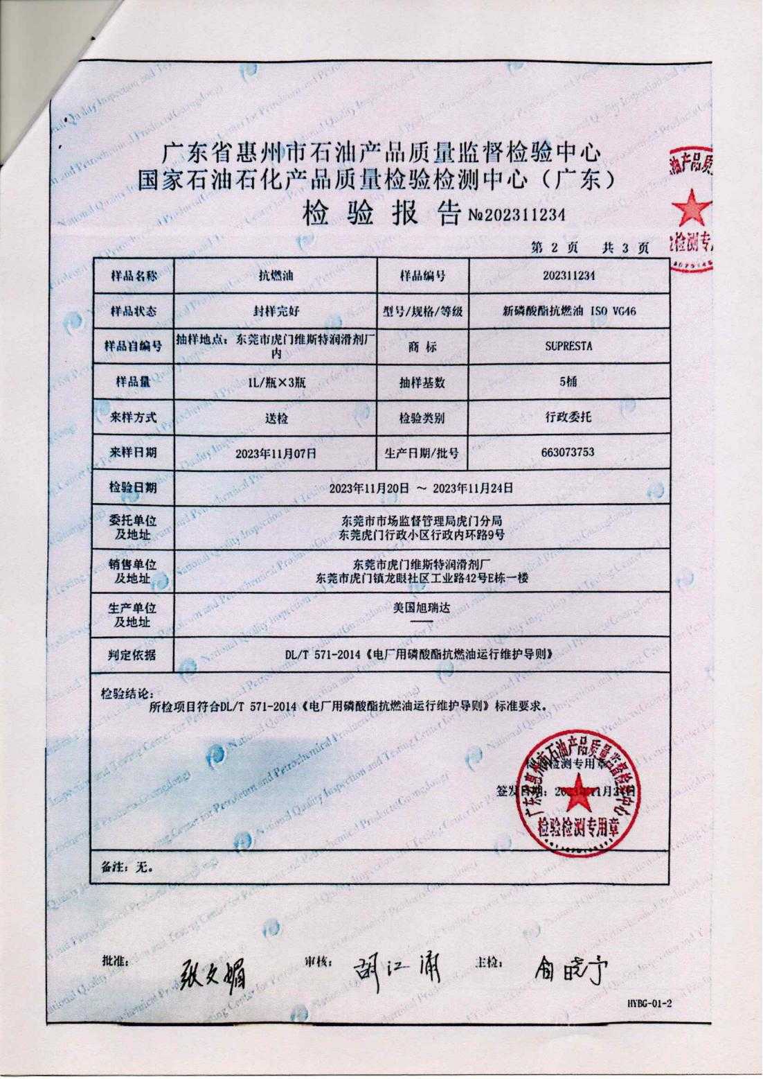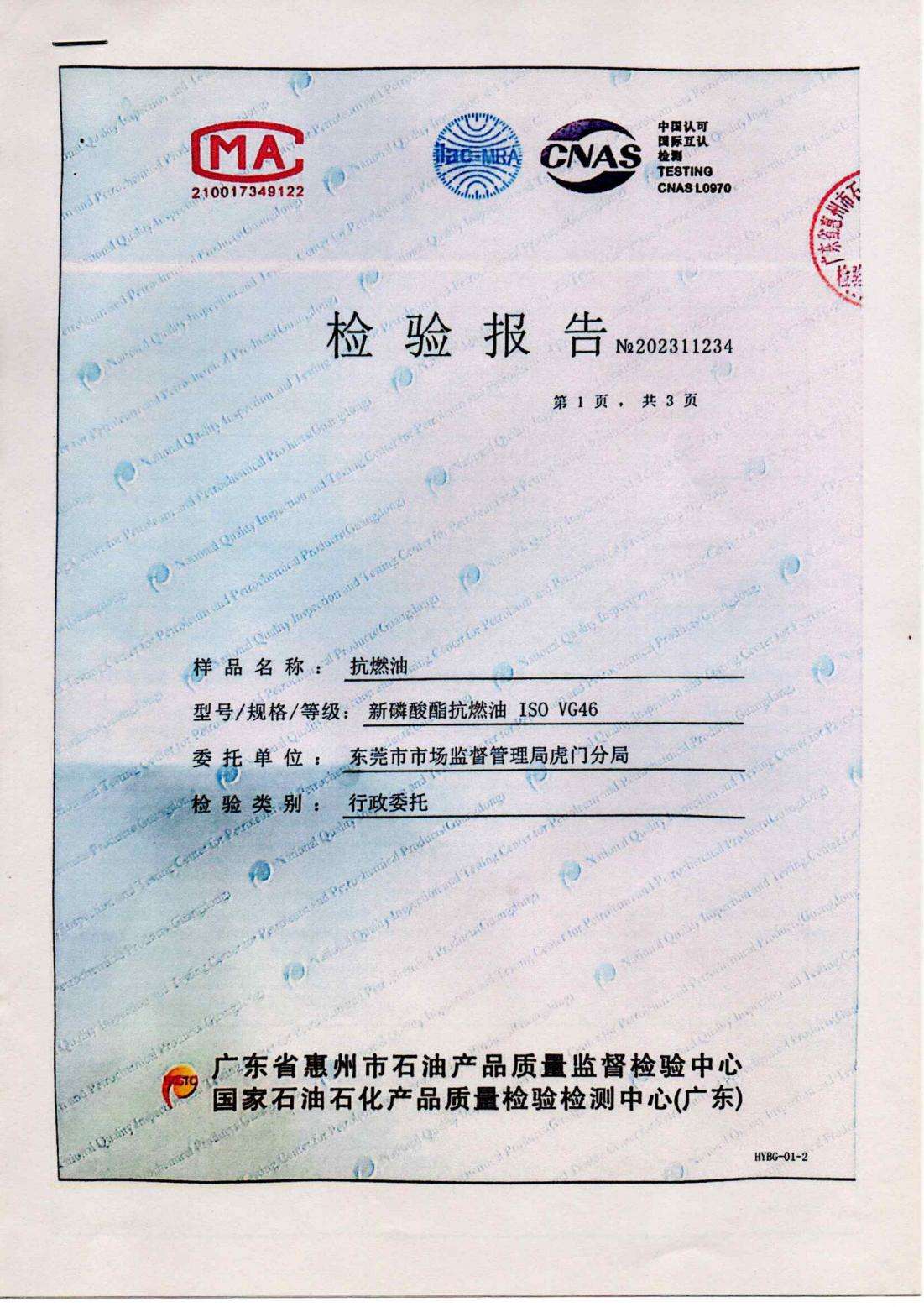 由于竞争对手恶意举报我公司所售产品质量不合格,广东省东莞市市场监督管理局采取执法行为,对我公司库存突击检查,并委托国家石油石化产品质量检验检测中心对我公司仓库库存磷酸酯抗燃油产品进行现场抽样化验,化验报告如下: